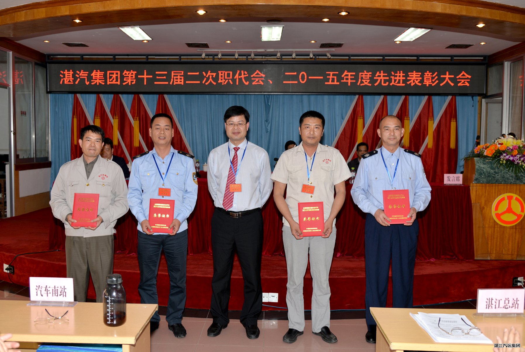 湛汽集团总经理吴定义(右三)在表彰大会上与获得“全国先进驾驶员”代表合影。